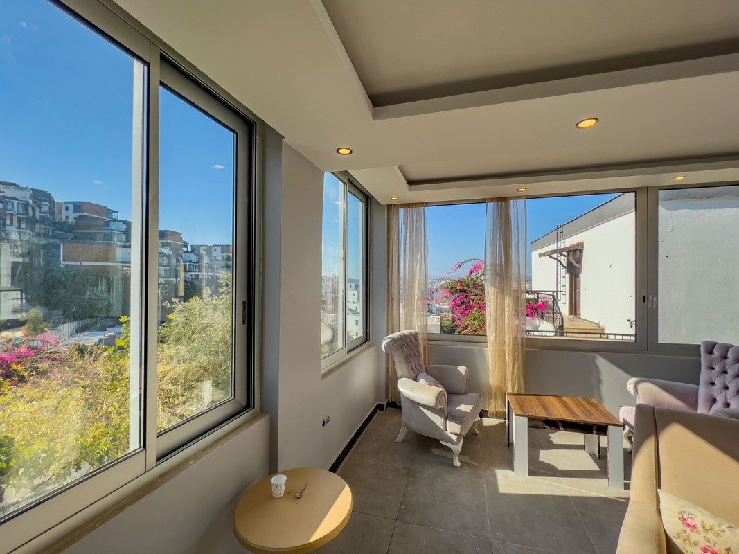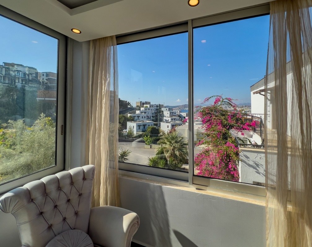 Bodrum Bardakcı'da Ortak Havuzlu Tesis İçinde yer alan Orta Kat Satılık Balkonlu Dairemiz de, Deniz manzarasının yanı sıra şehir manzarasının keyfini yaşayabilirsiniz.
