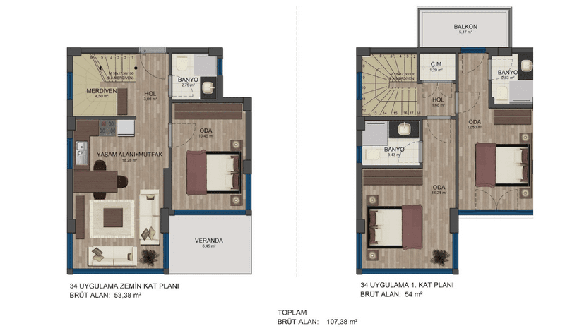 Oda Sayısı ve Alanı: Her villa 3 yatak odası ve 3 banyoya sahiptir. Net 80 m² / Brüt 107 m²'lik kullanım alanı ile ferah ve konforlu bir yaşam sunar.